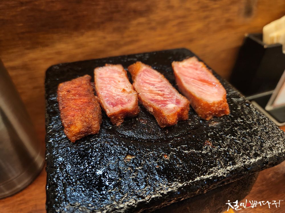 겉은 초벌구이로 익혀있고, 내부는 마블링이 보이는