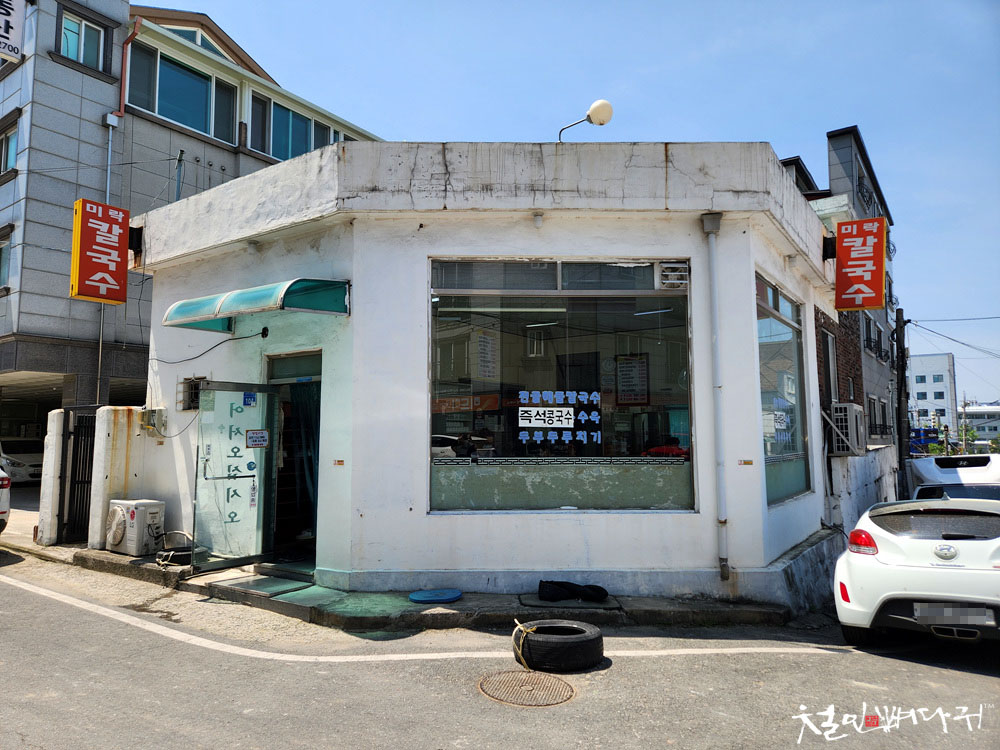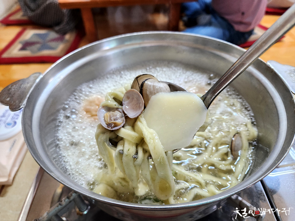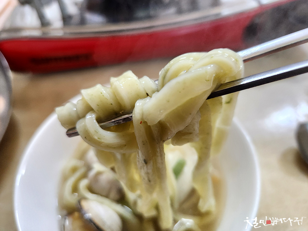 바지락이 들어간 깔끔한 국물의 칼국수입니다.