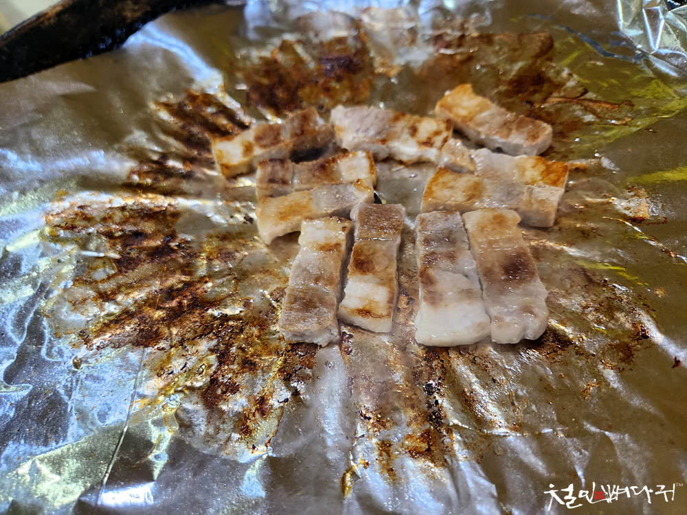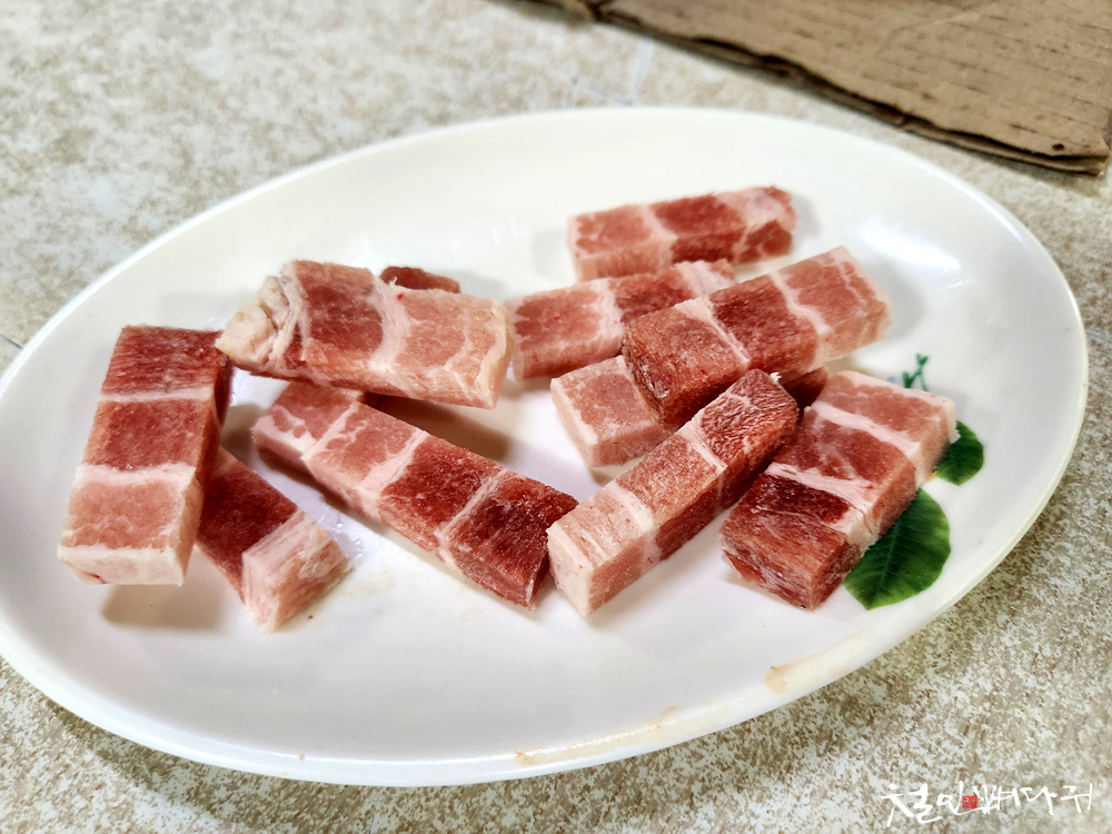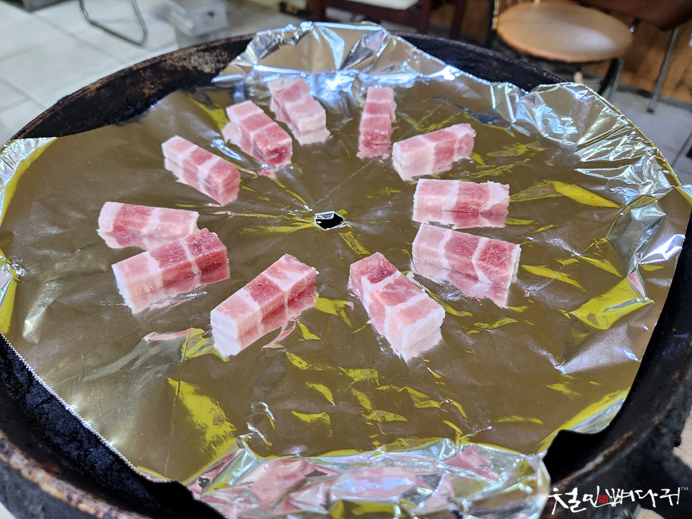 적은 양의 삼겹살을 불판에 가지런히 올려두고,