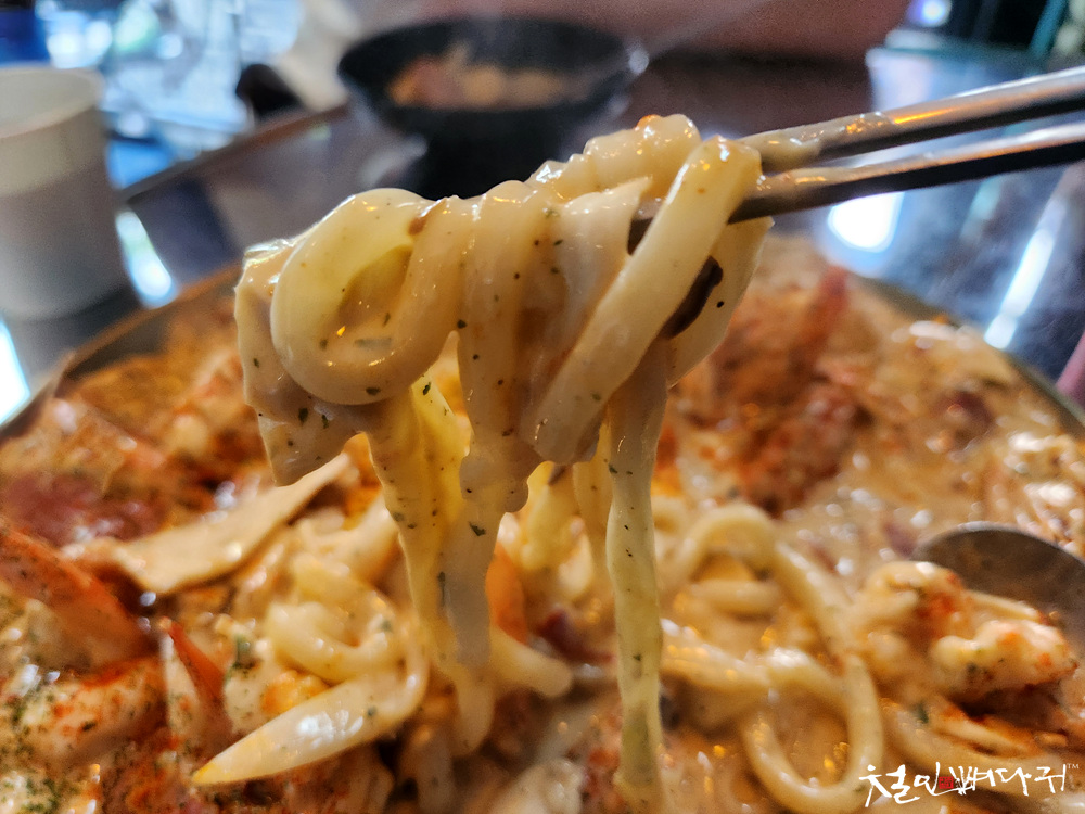 안에 우동면이 들어 있고, 크림파스타 같은 느낌입니다.
