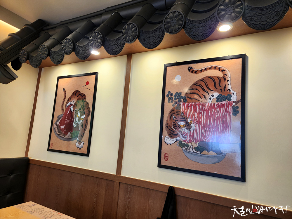기와와 민화로 한쪽 벽면을 채워서 한국적인 모습입니다.