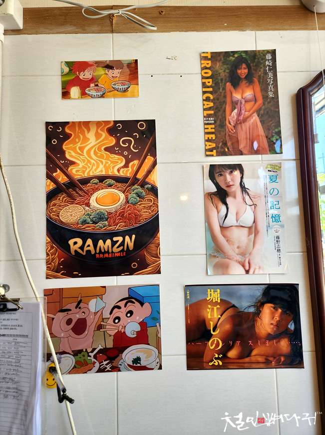 일본 느낌 나는 사진들이 벽에 붙어 있습니다.