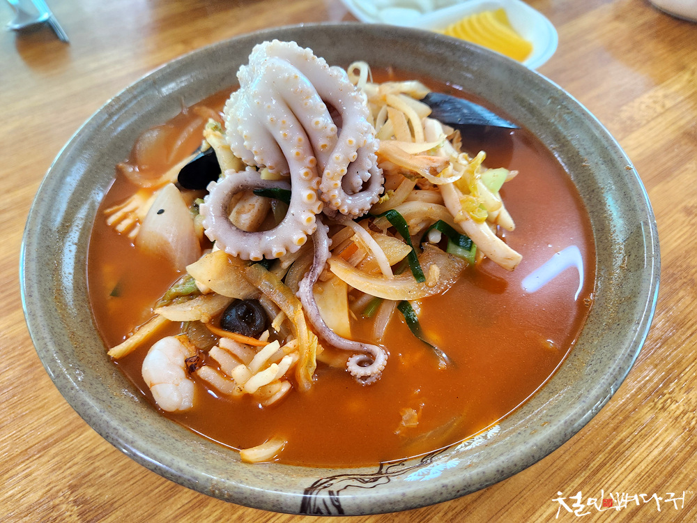해물짬뽕인데, 국물이 맵지 않고 담백했습니다.