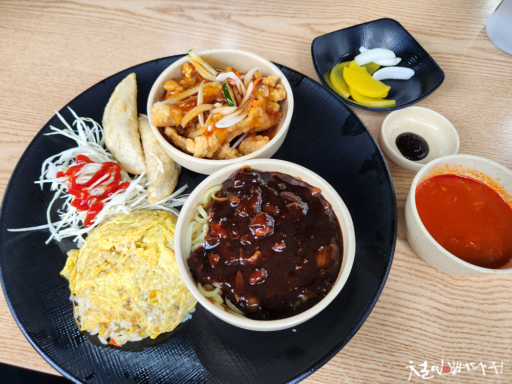 양배추사라다. 볶음밥. 짜장면. 미니탕수육. 만두. 짬뽕국물