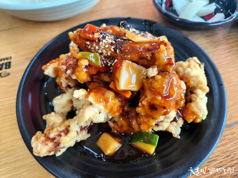 탕수육은 진한 색을 띄고 있었고, 고소했습니다.