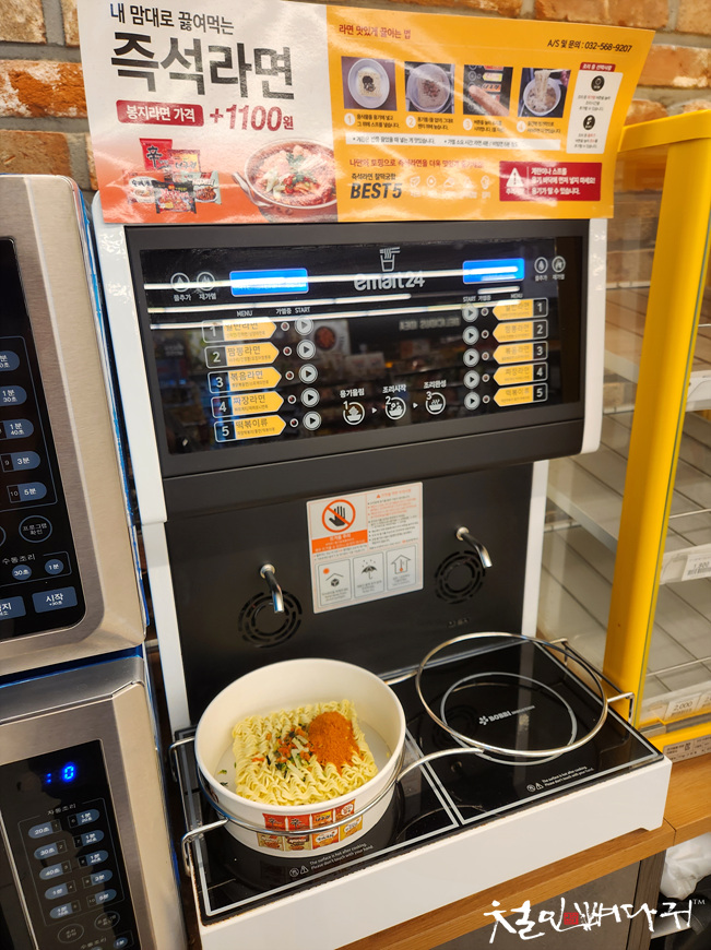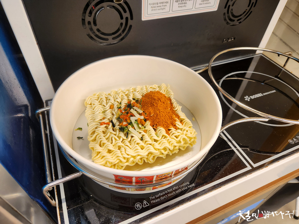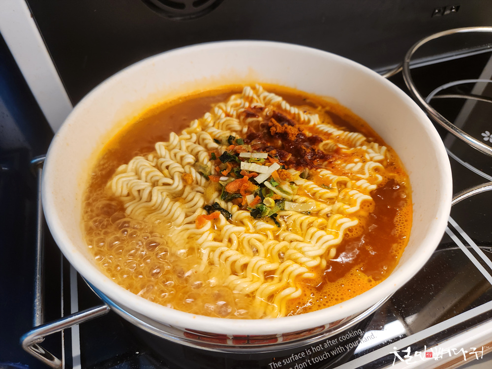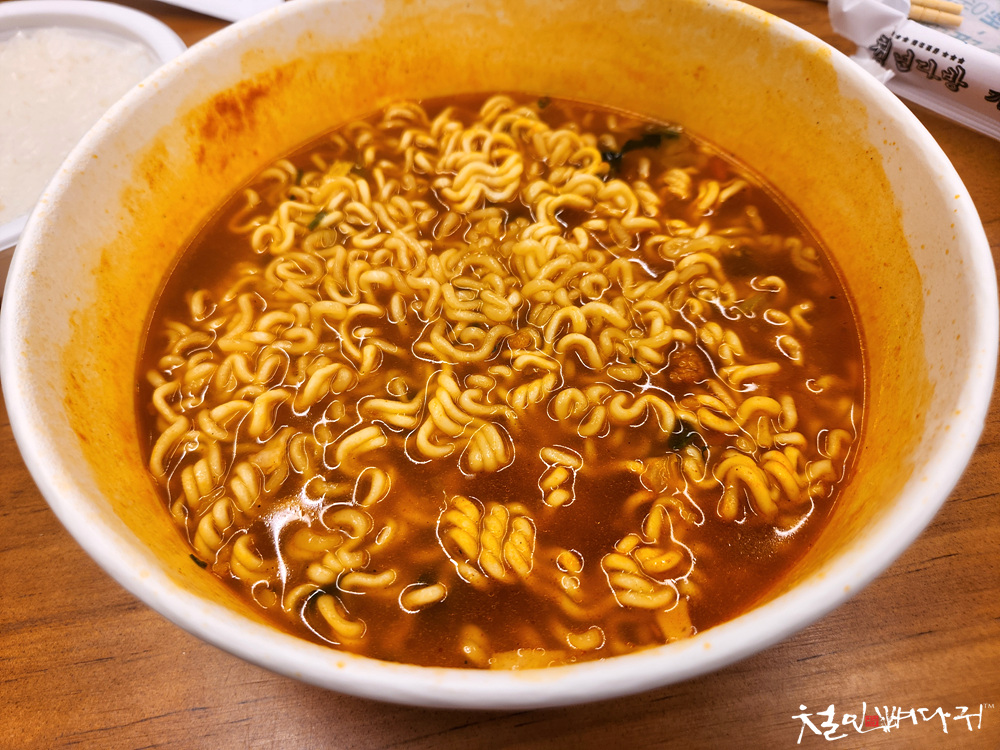 즉석라면기계에서 바로 끓여 먹는 즉석라면.