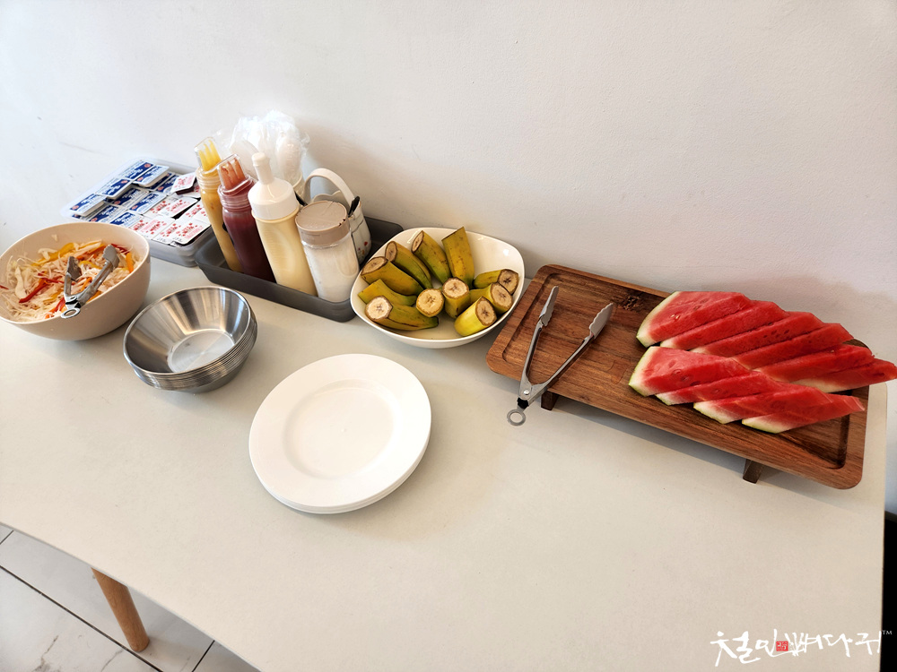 토스트를 만들 수 있는 재료와 과일로 바나나, 수박이 있습니다.