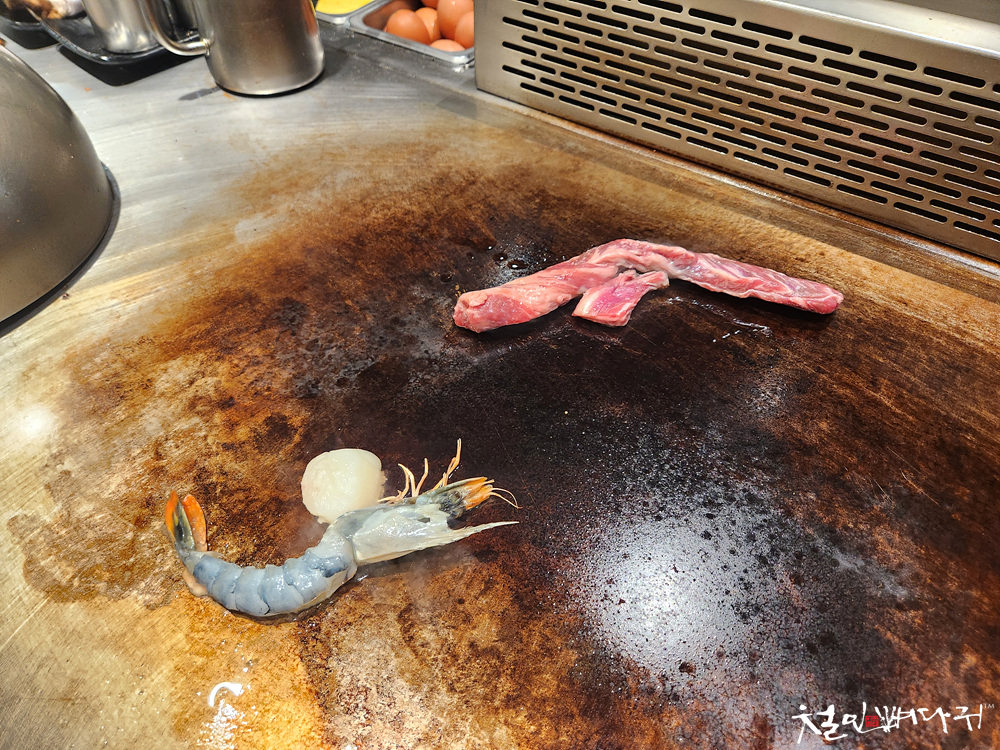 관자, 새우, 소고기를 굽기 시작합니다.
