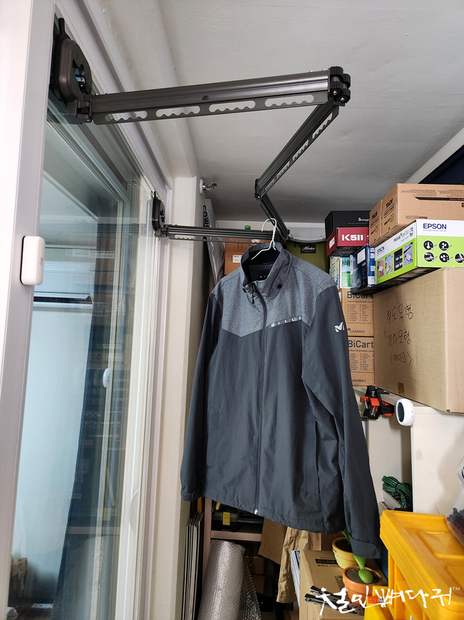 좁은 집에서 건조대를 펴고 빨래를 널고,