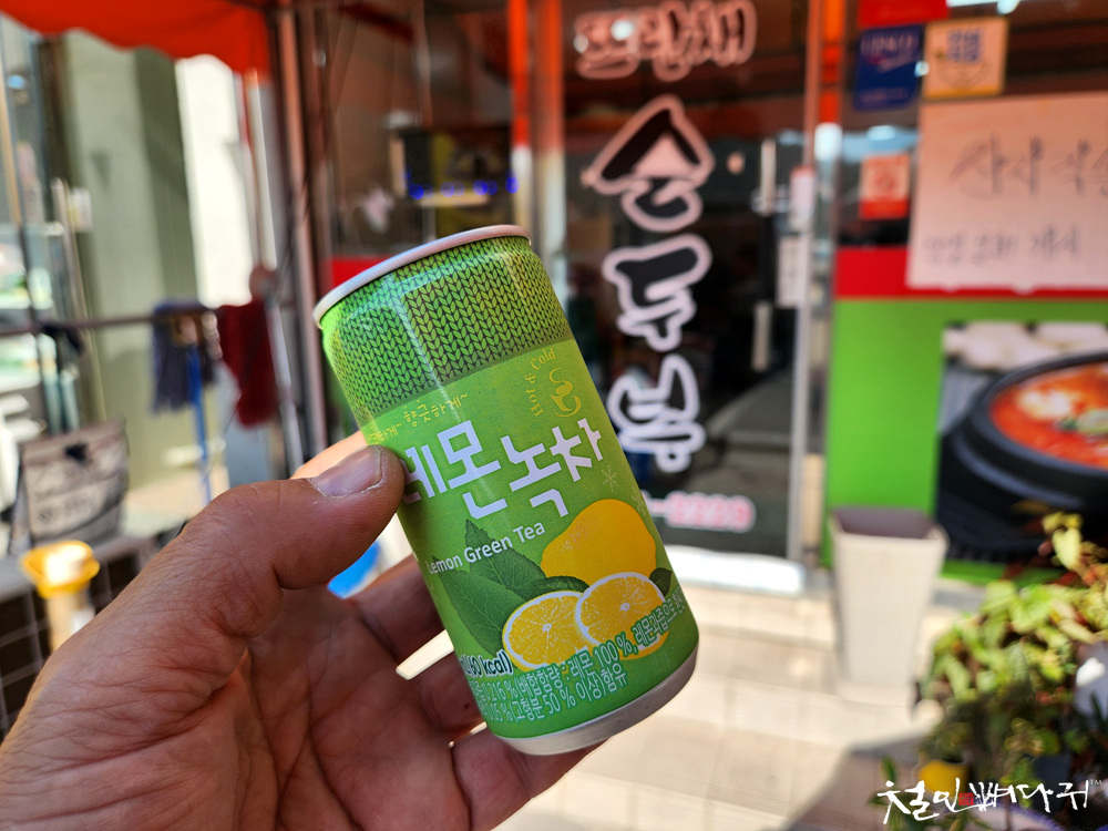계산하고 나오는데, 냉장고에서 캔커피, 캔레몬녹차 중에