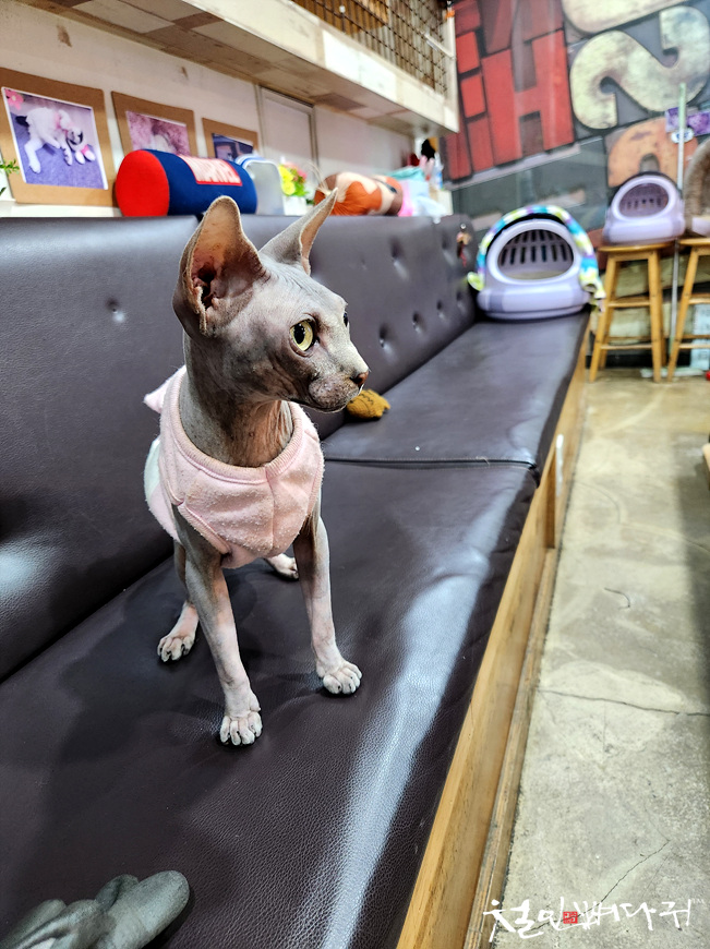 고양이 사진들도 벽에 붙어 있습니다.