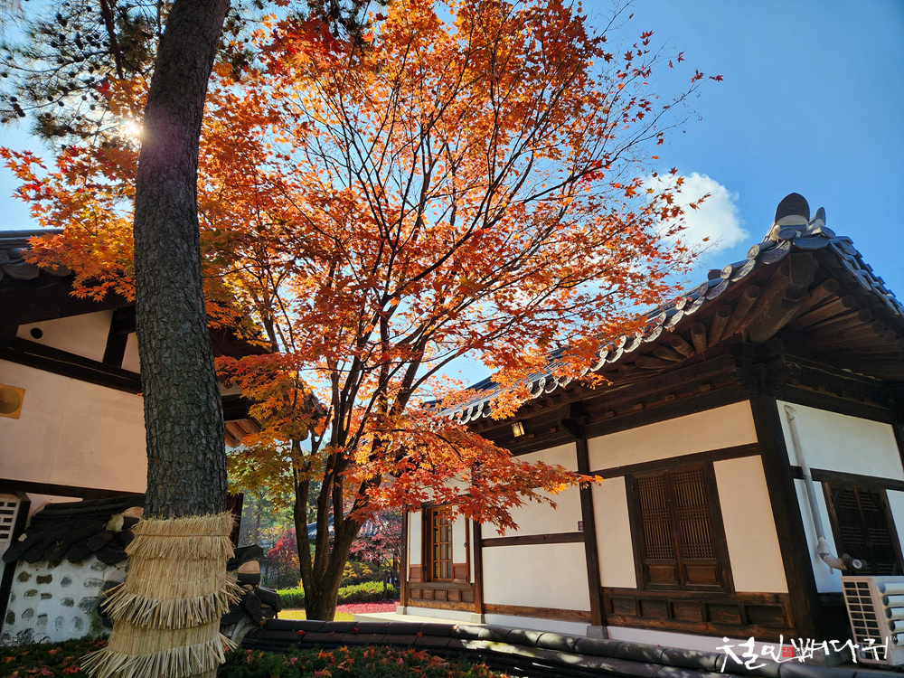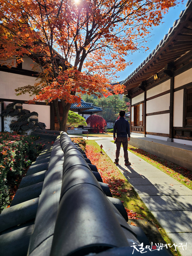 빨간 단풍이 햇빛에 반사되어 한옥과 어우러져