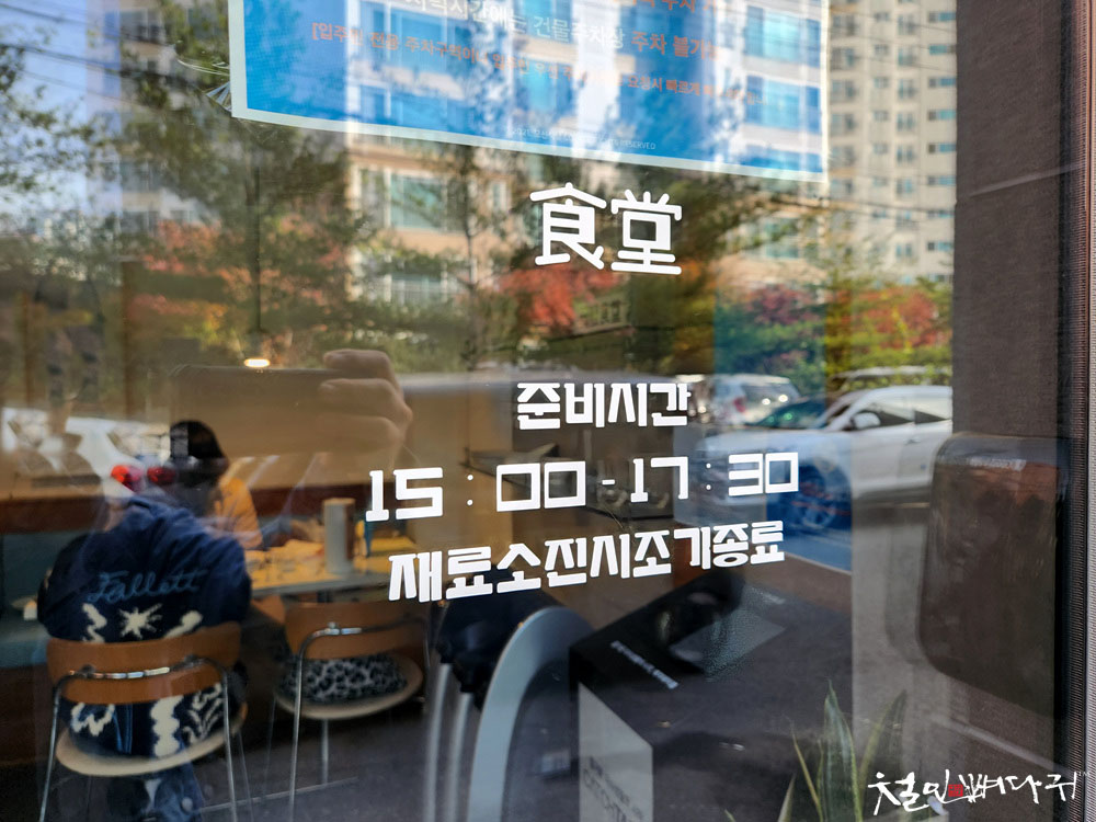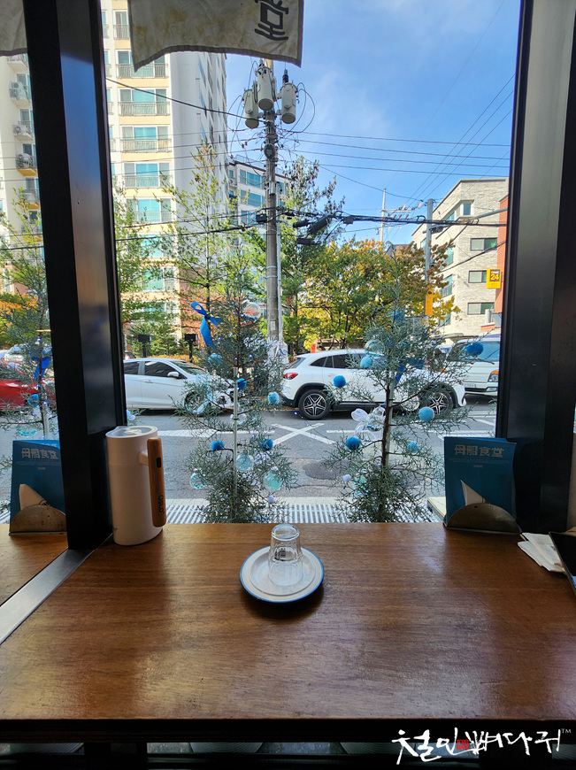 식당 밖, 도로가 바로 보입니다.