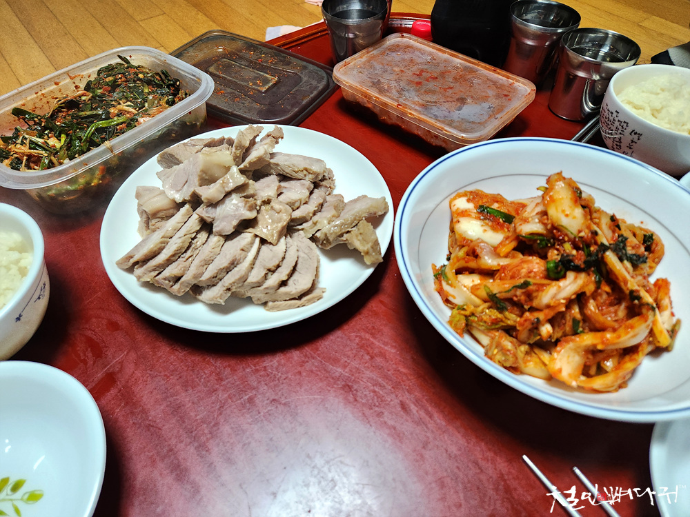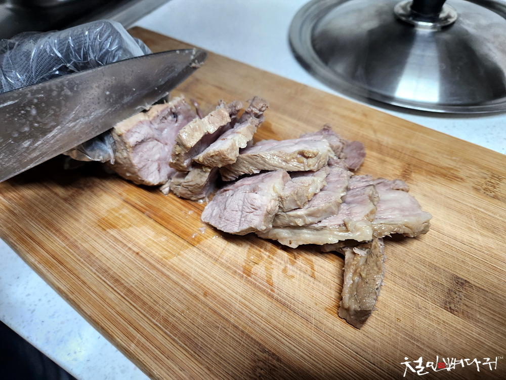 친구집에 가니 목살로 수육을 만들어 자르고 있었습니다.