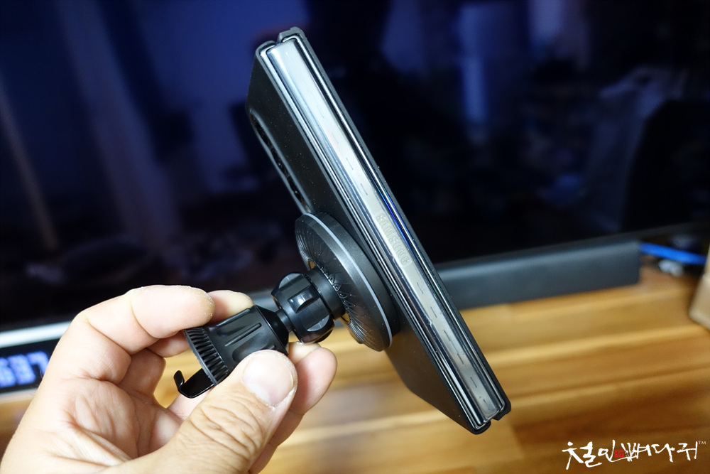 자동차 송풍구에 무선충전이 가능한 자석거치대입니다.