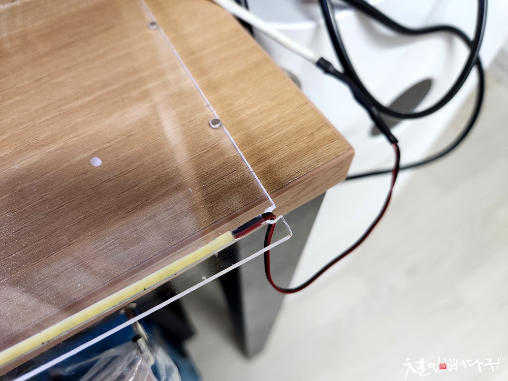 아크릴 뚜껑 끝에 LED에서 나오는 전선이