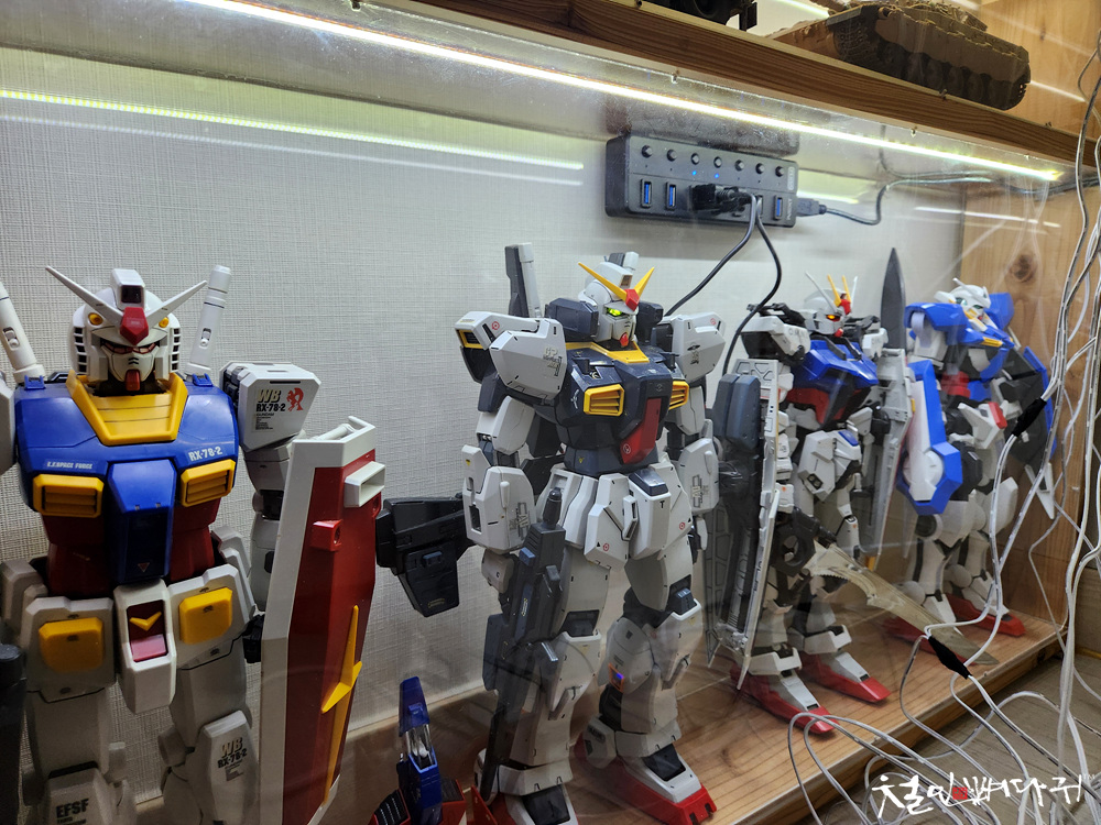 PG건담들 중, 중앙의 2대는 별도의 USB 5V를 연결해서