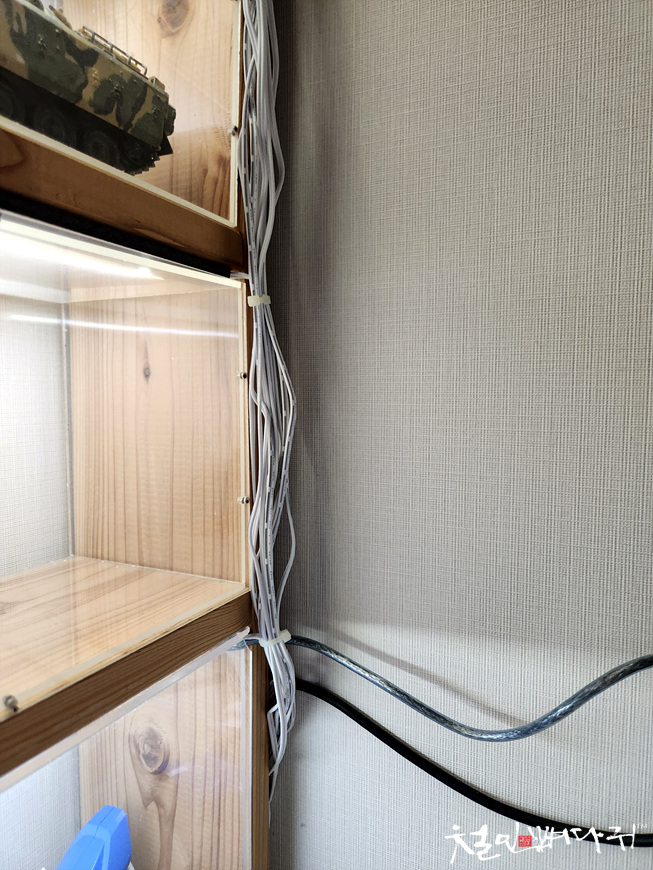 진열장 옆, 벽쪽으로 전선들을 내려서 묶어주었습니다.