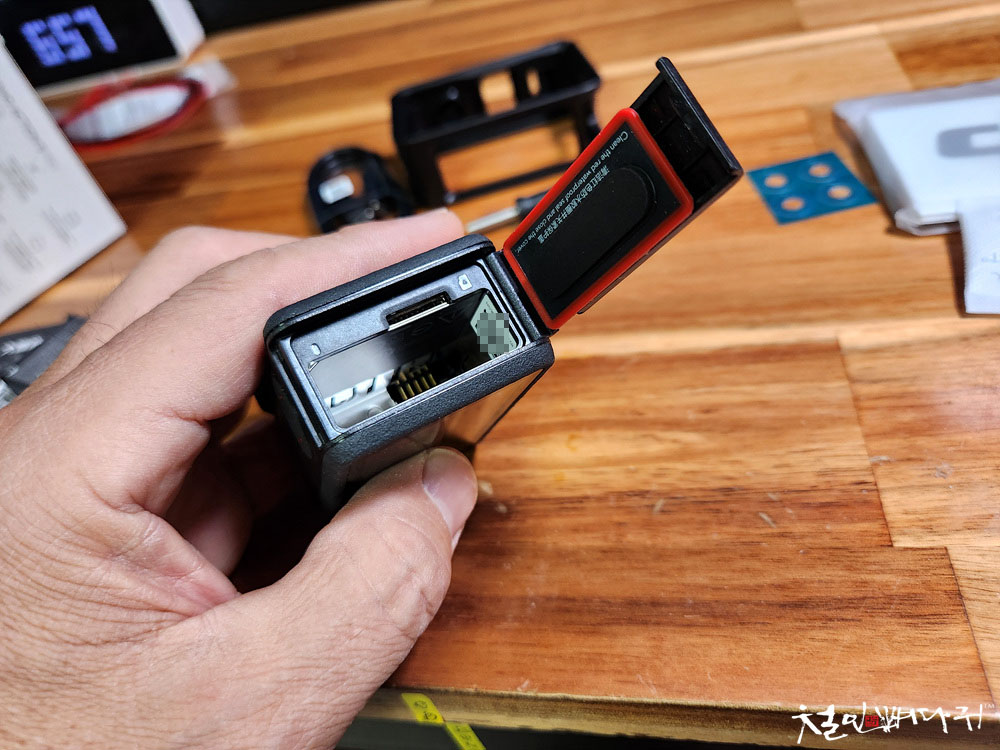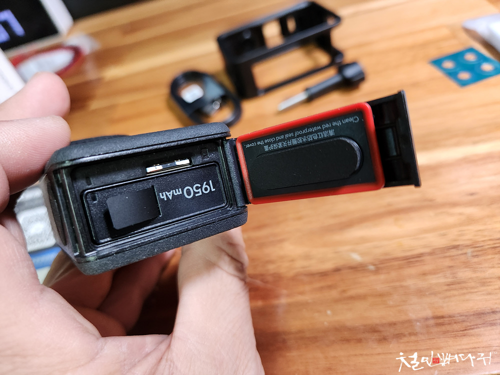 액션캠을 장착하고 배터리, 메모리, 충전 같은 모든 활동이 가능합니다.