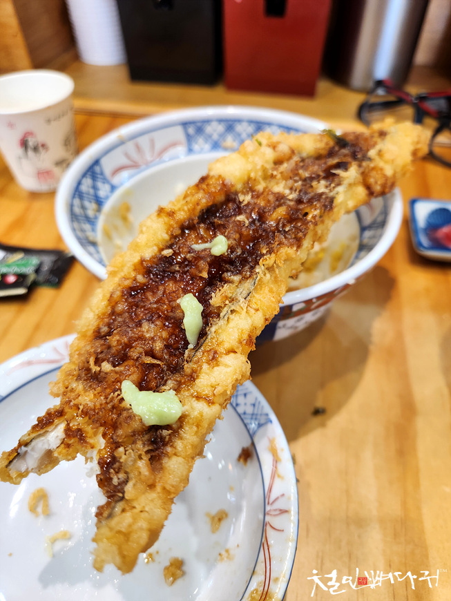 아나고텐동에 아나고(장어)는 한 마리가 통으로 나옵니다.