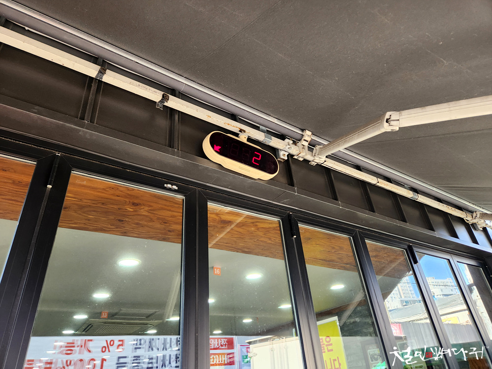식당 앞, 처마 아래에 번호표 알림판이 있습니다.