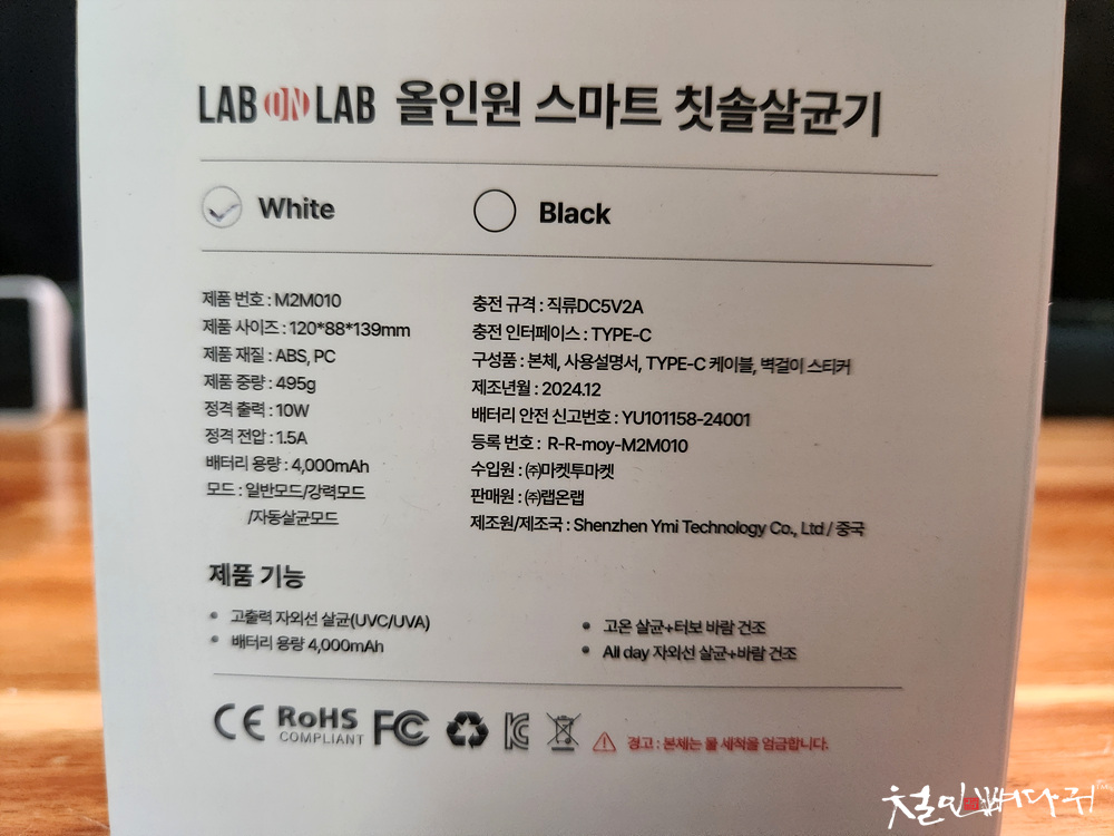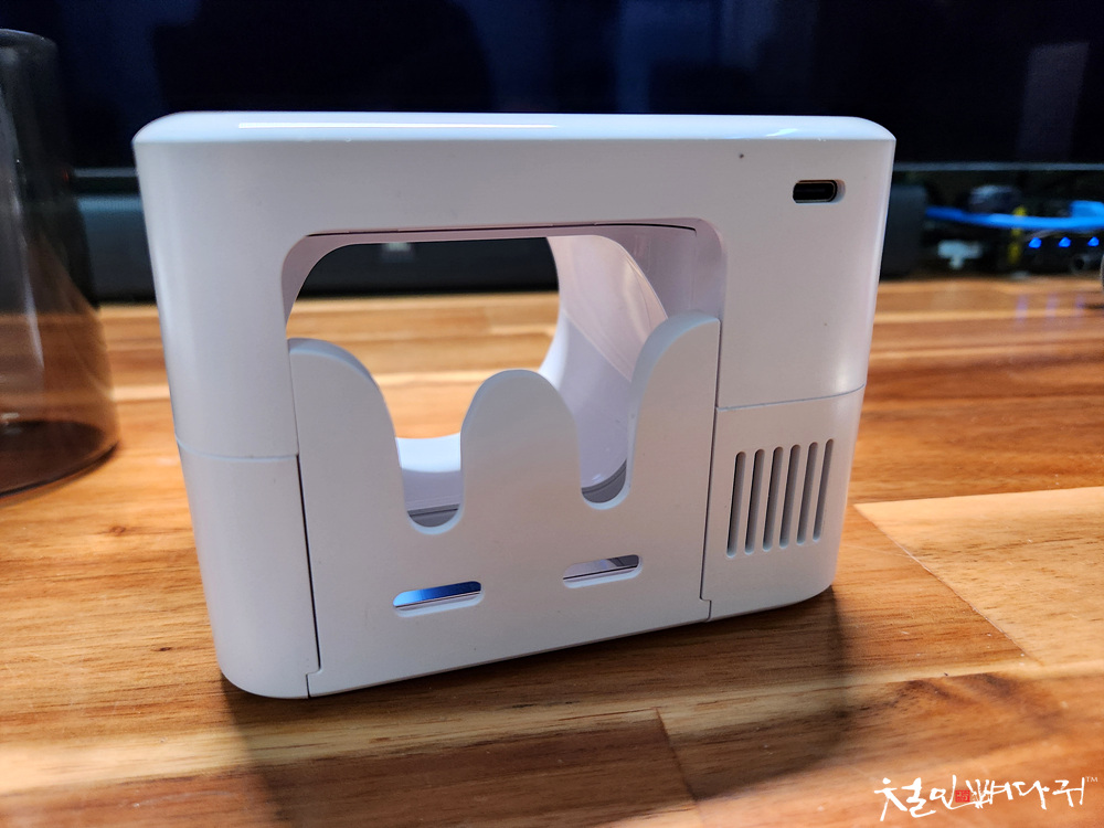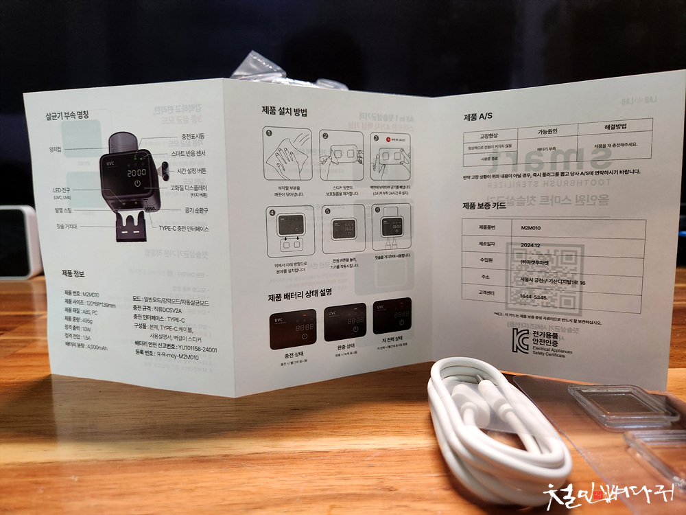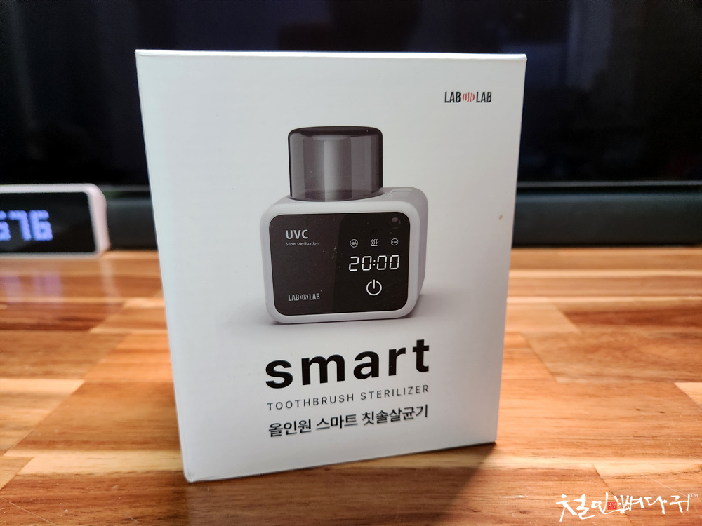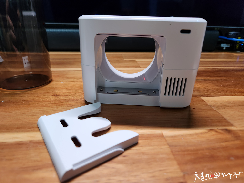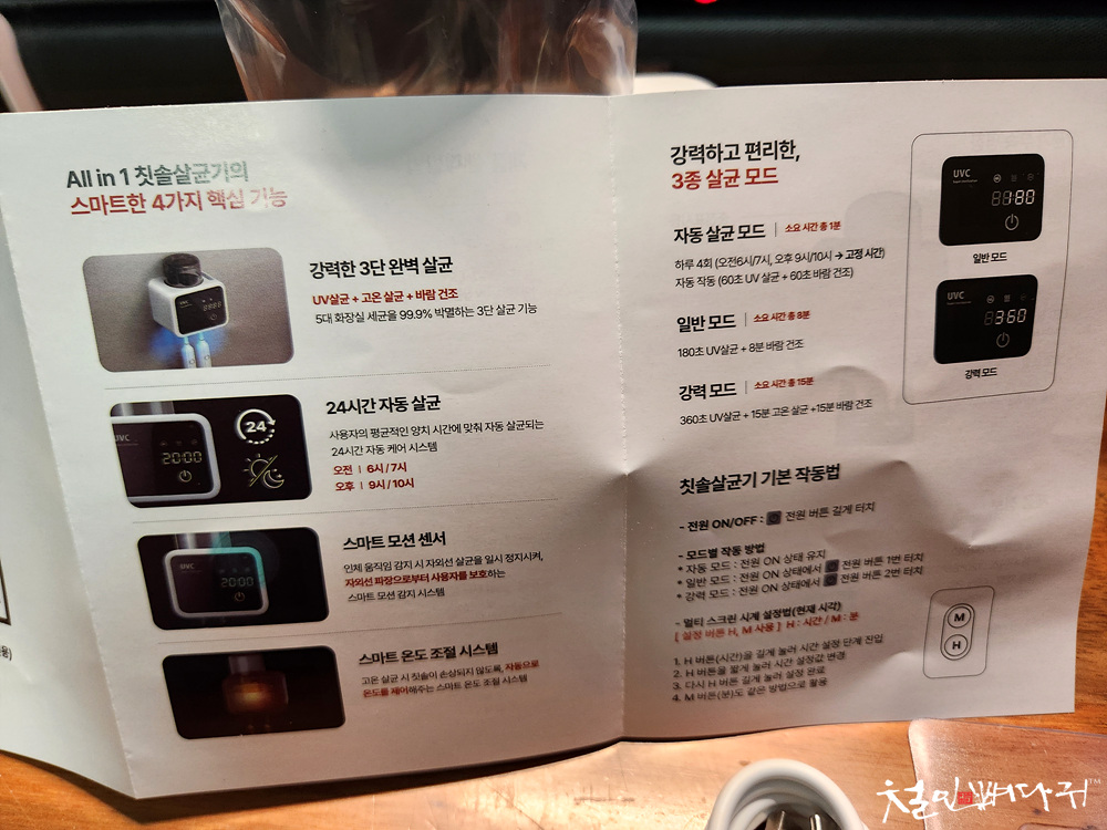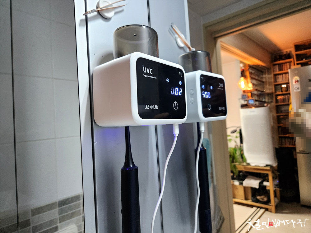 아래쪽, 칫솔 살균하는 곳의 UV 빛과