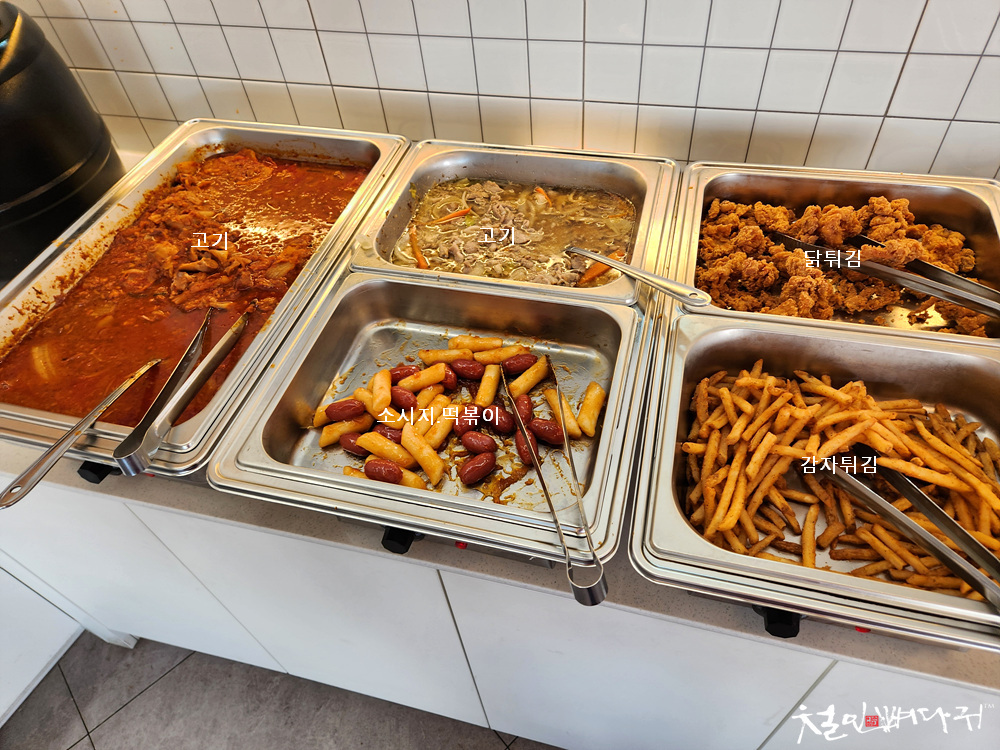 고기는 2종류, 닭튀김 하나, 소시지 떡볶이, 감자튀김