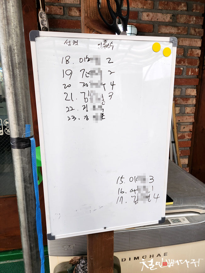 식당입구 앞에 화이트보드에 대기순서를 적어놓습니다.