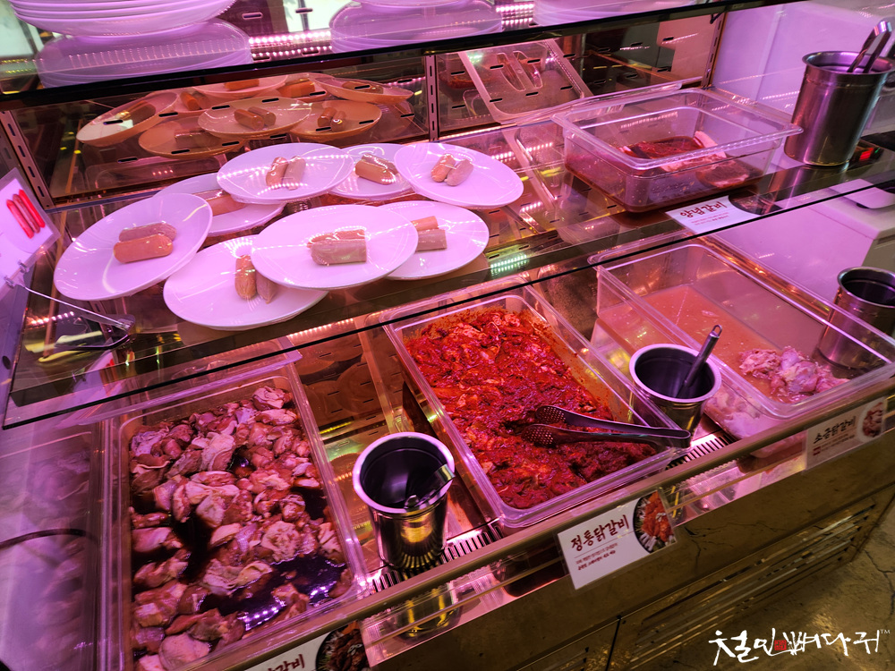 닭갈비 3종과 양념갈비, 소시지가 준비되어 있습니다.