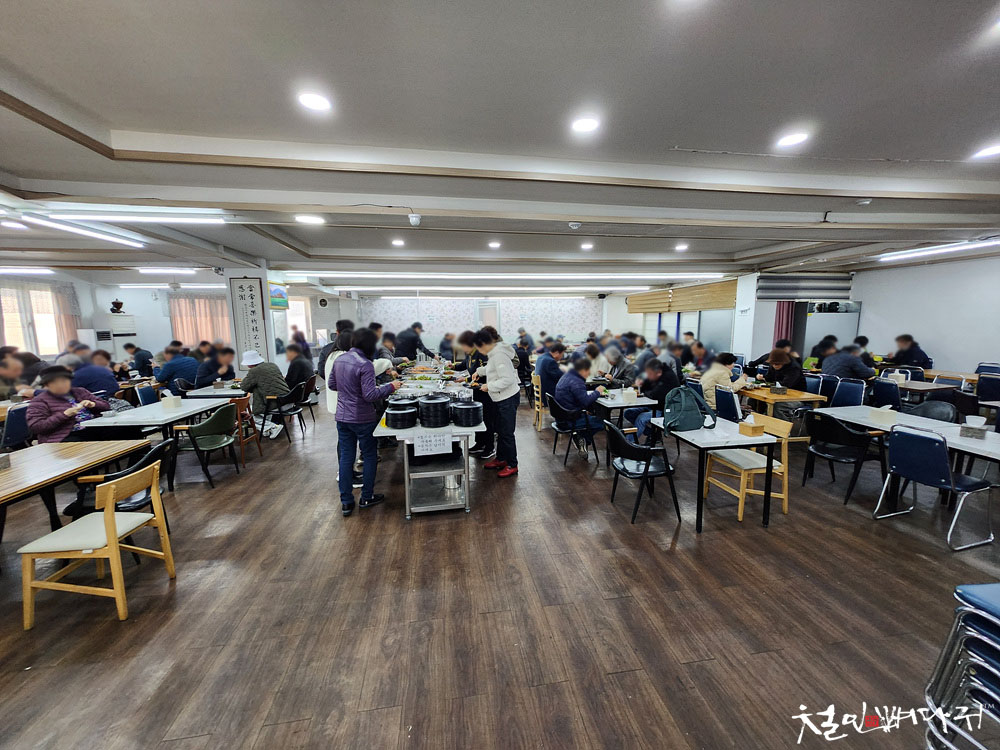 안쪽으로 넓은 식당이 있었고, 많은 사람들이 식사 중입니다.
