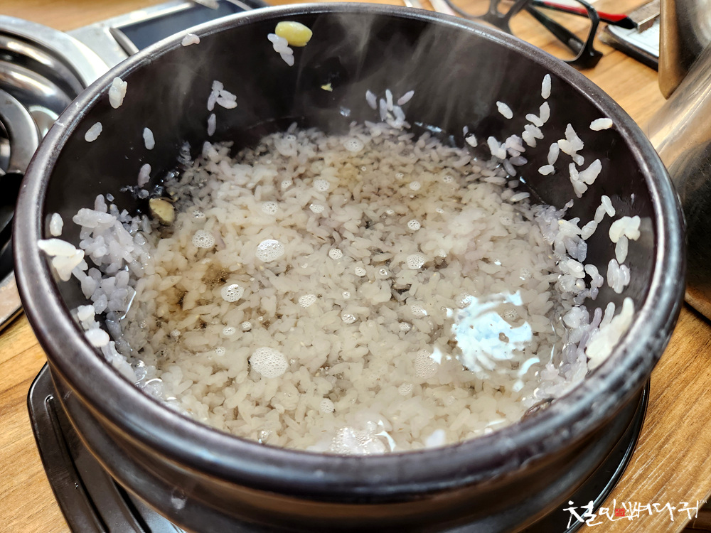 뚝배기에 밥을 갓 지은 상태로 가져다주는데,