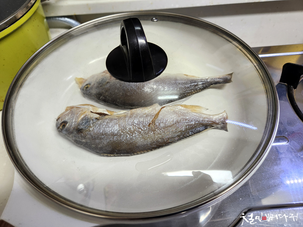 접시에 키친타월 깔고, 보리굴비를 꺼냈습니다.