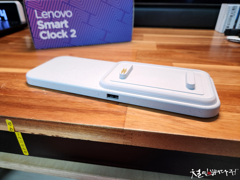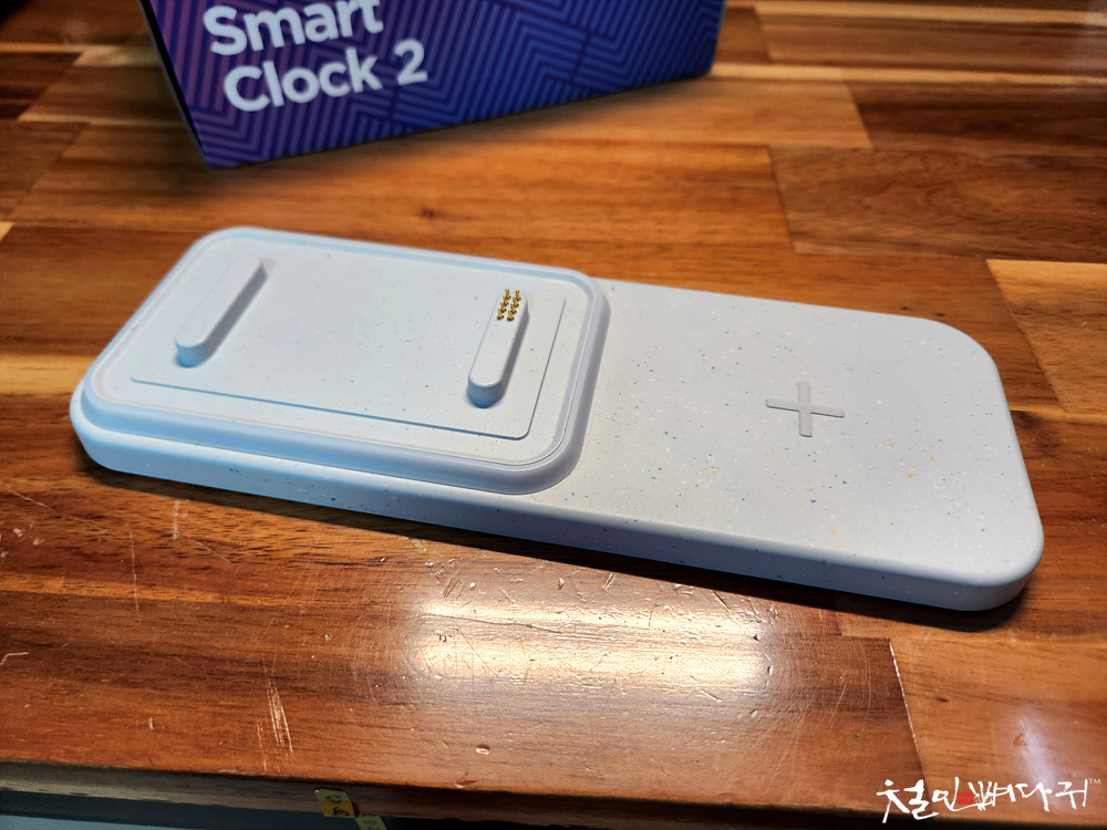 스마트클락2는 추가 받침이 있고, 무선충전 기능을 지원합니다.