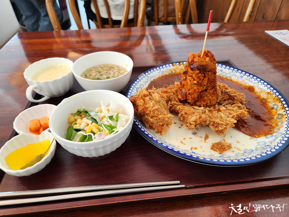 돈까스 위에 볶음밥을 엑스포타워 모양으로 담았습니다.
