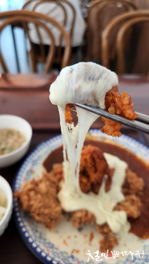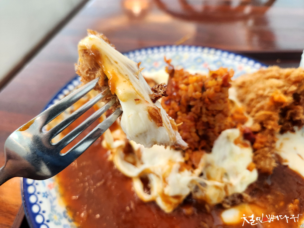 뜨겁게 데워진 치즈를 김치볶음밥과 돈까스 위에