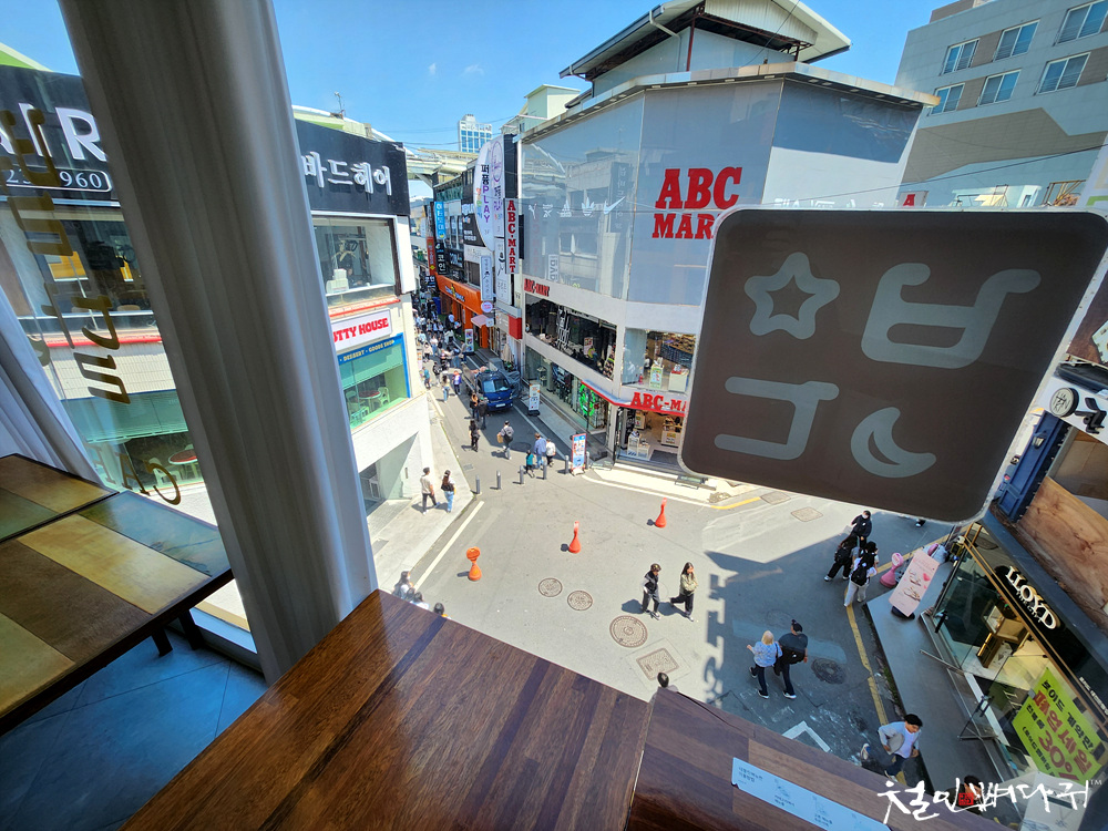안쪽 끝에 창가에 앉아서 사람들이 다니는 모습을 봅니다.