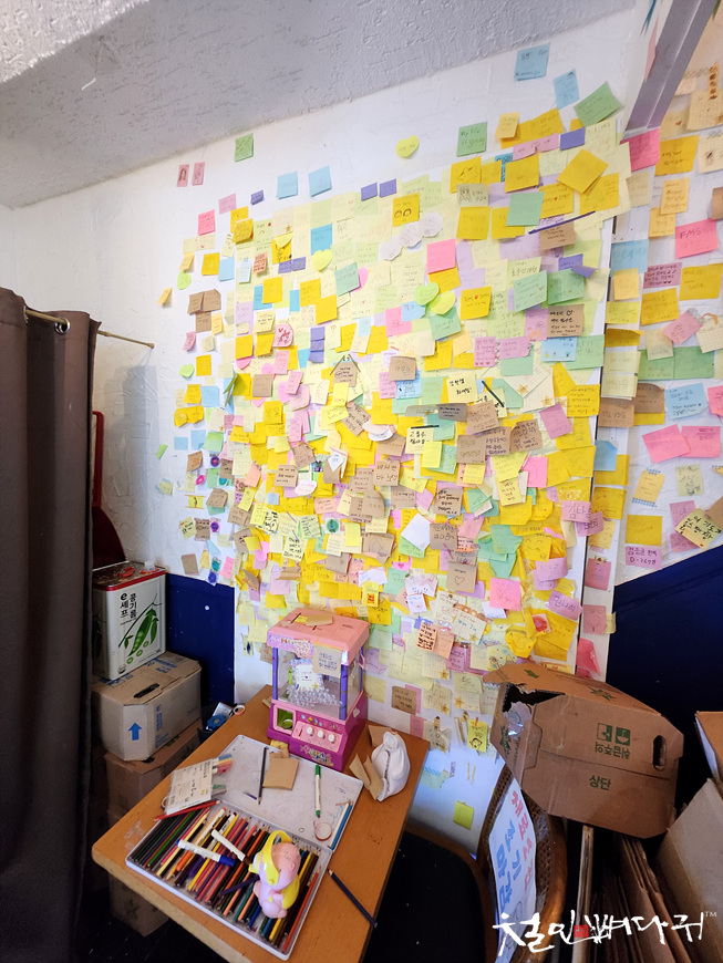 벽면에 사연 있는 메모지가 많이 붙어있습니다.