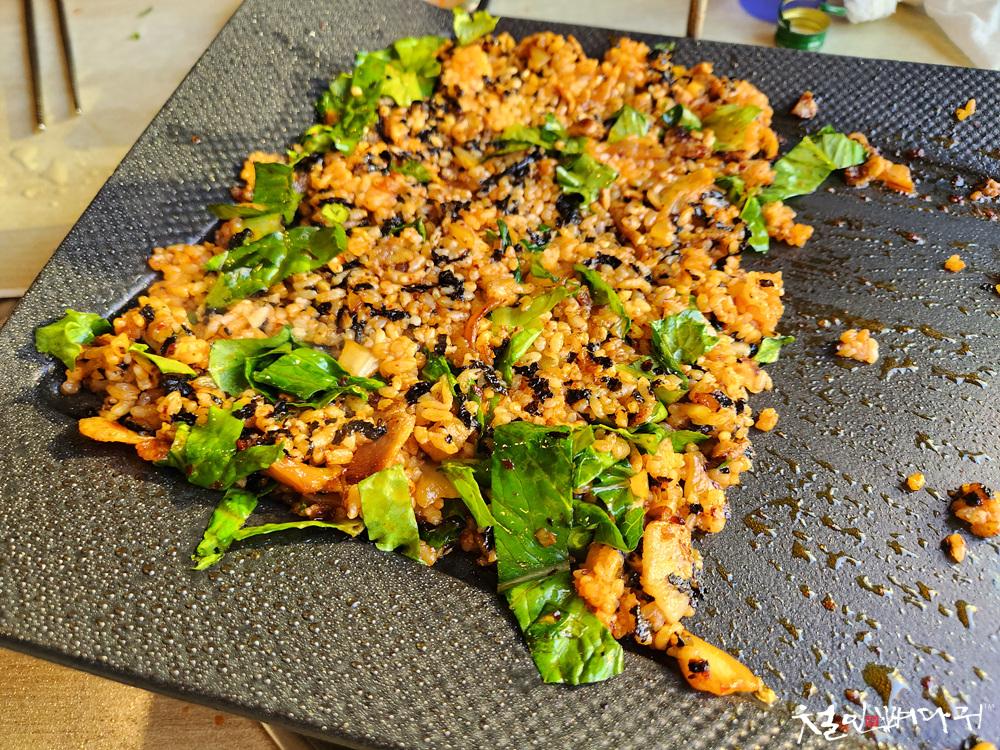 양념이 된 밥과 김가루, 야채 등을 넣어서 잘 볶아줍니다.