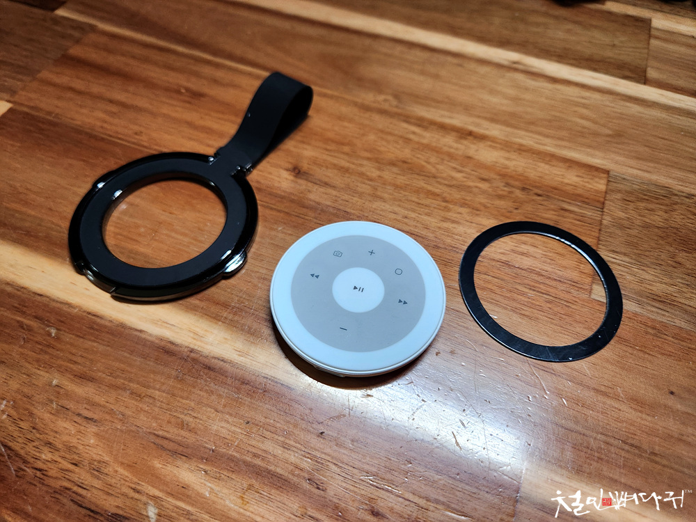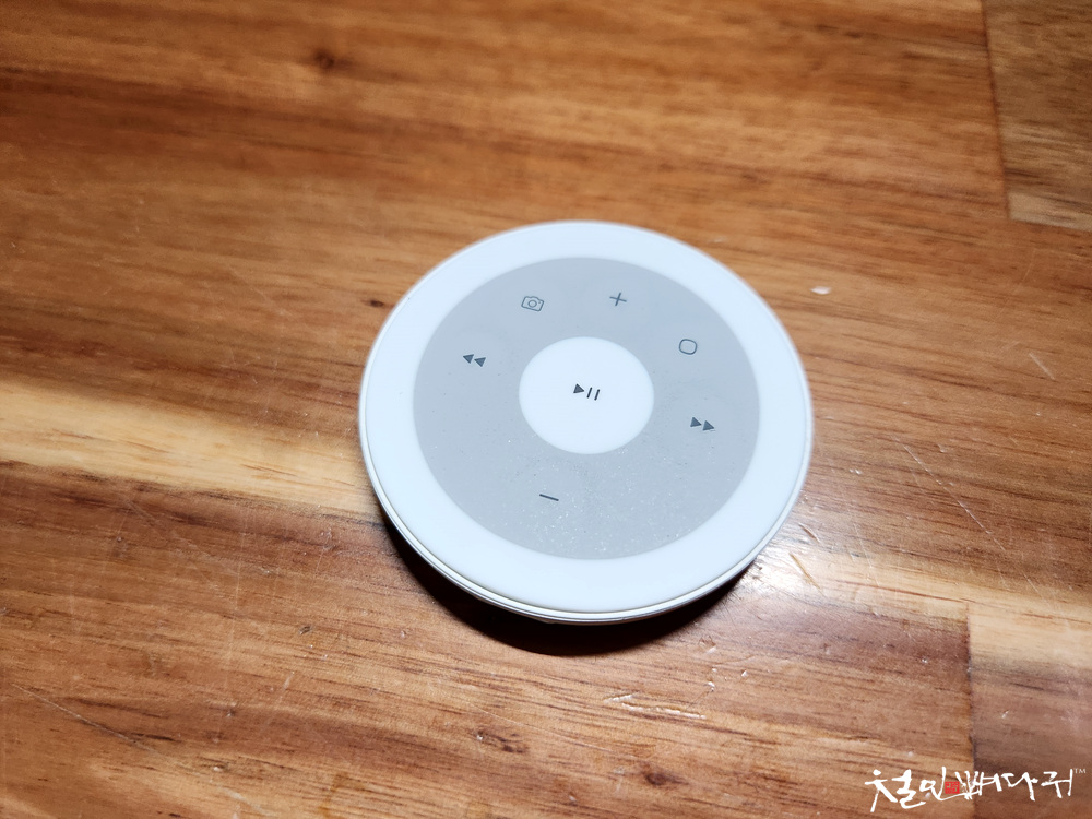 블루투스 리모컨은 한손에 잡기 좋은 크기로