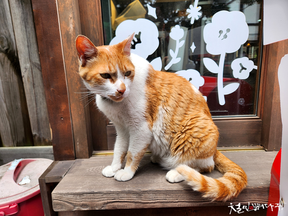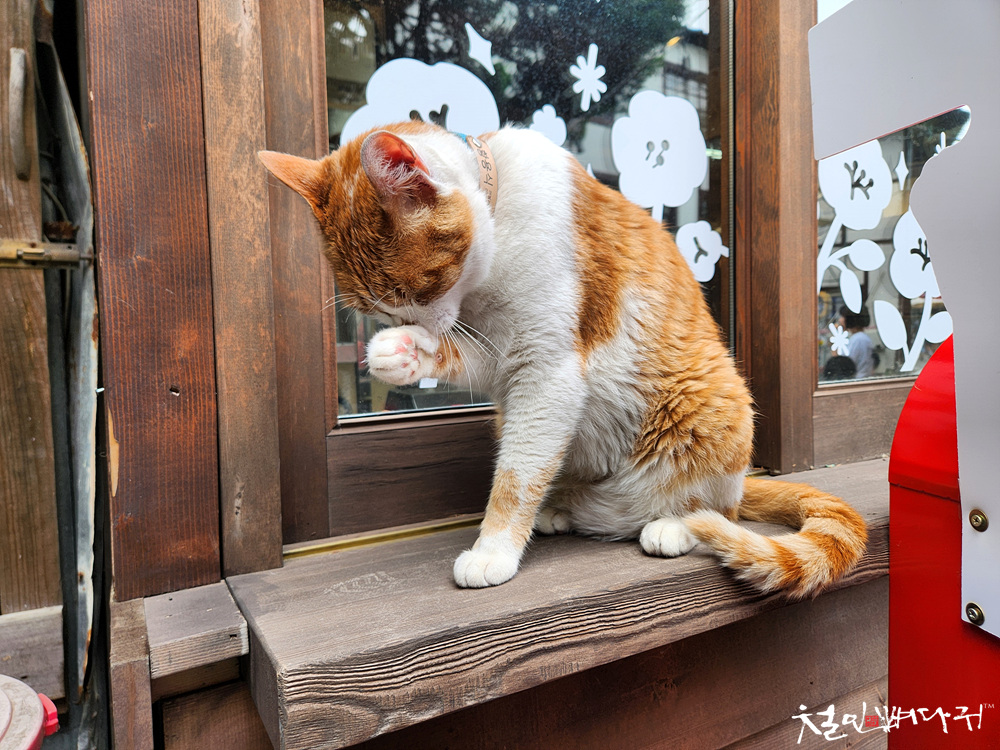 창틀에 앉아서 고양이세수하는 모습을 담았습니다.