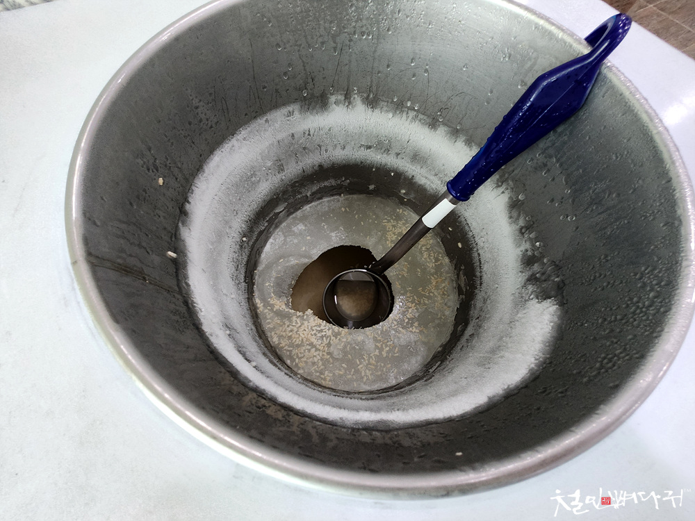 식당 입구에 살얼음 동동 떠있는 식혜가 있습니다.