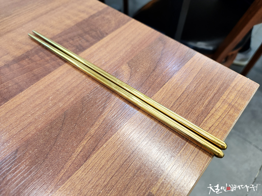 냉면그릇과 수저, 젓가락은 놋그릇 재질인 듯