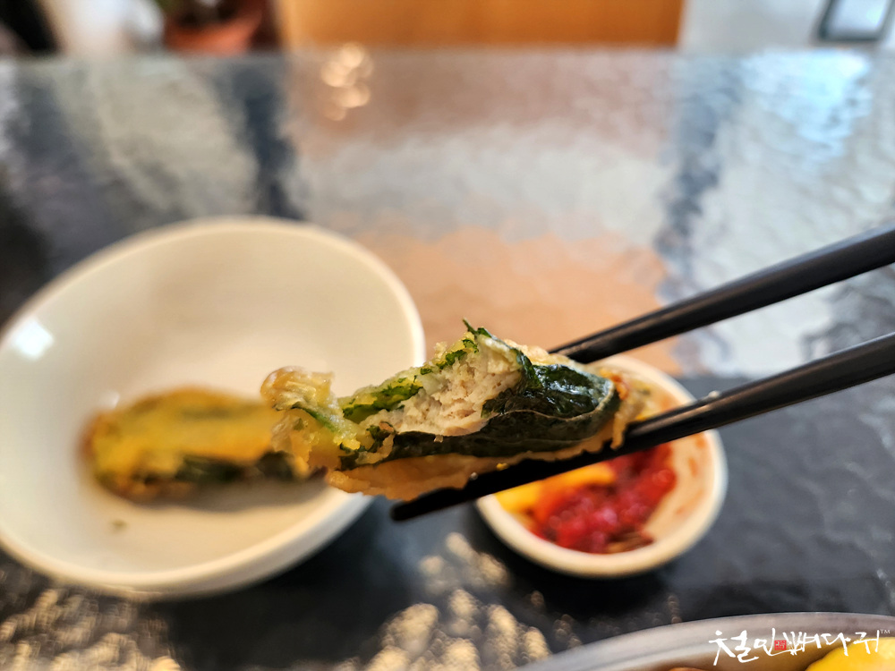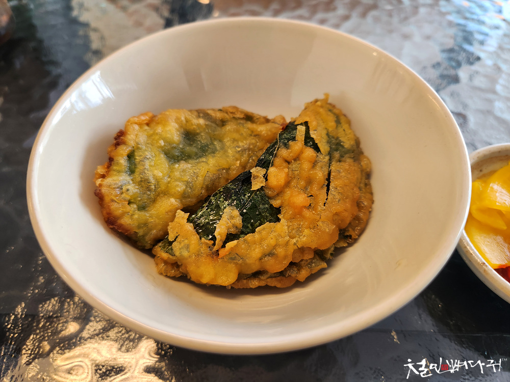 식사하고 있는데, 깻잎 전 2개를 가져다줍니다.