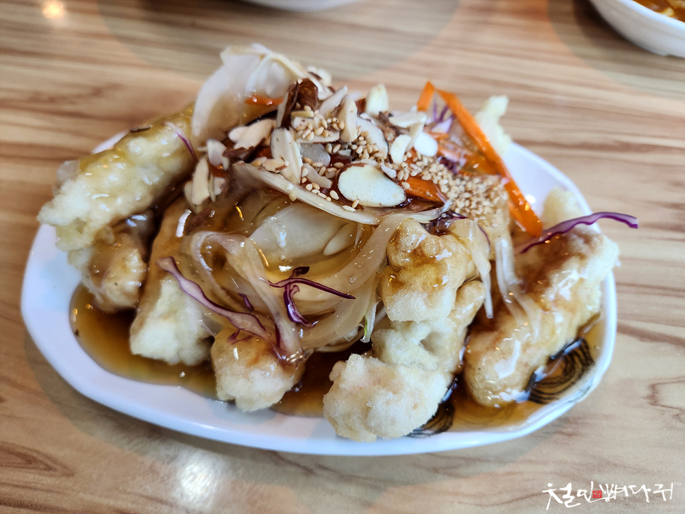 부먹에, 고기 두툼해서 단단한 느낌입니다.