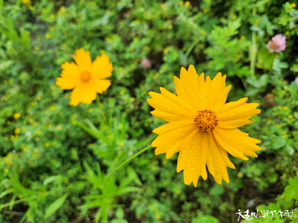 비가 잠깐 내려서 대지가 촉촉했습니다.