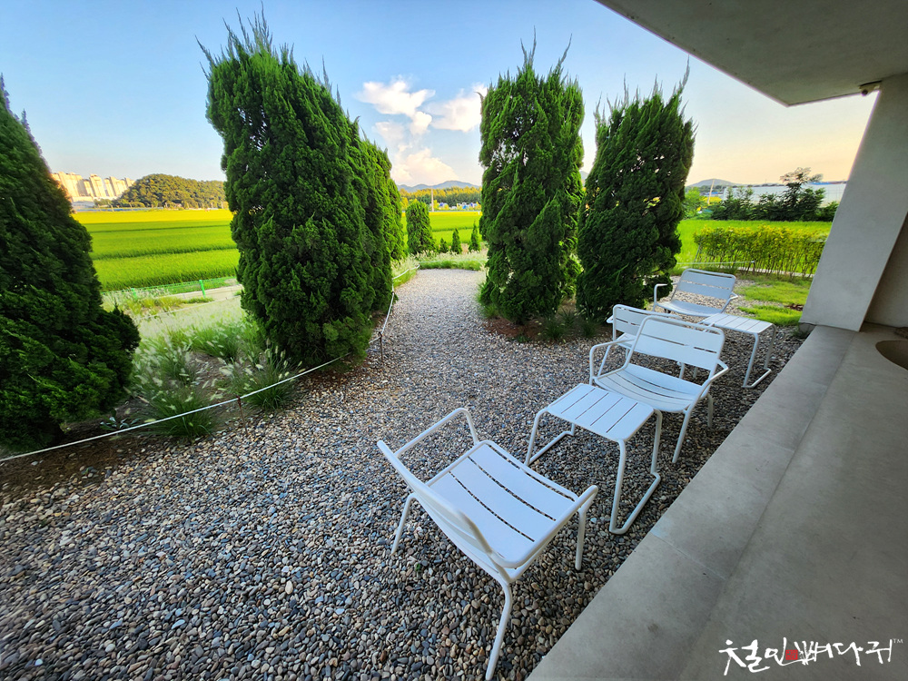 카페 뒤쪽, 초록의 논과 잘 가꾸어진 정원이