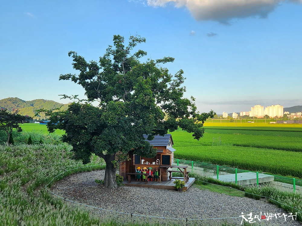 나무 한그루와 작은집과 캐릭터들이 있는