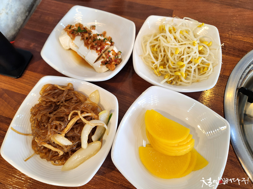순두부, 잡채, 콩나물 기본이고 단무지 있습니다.