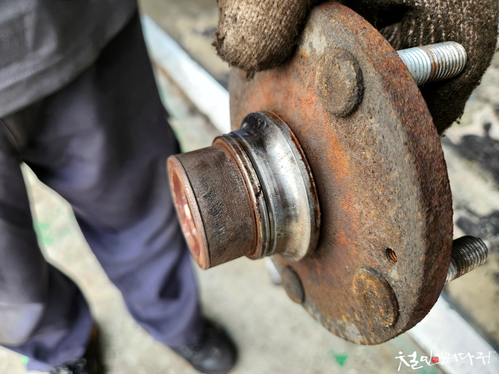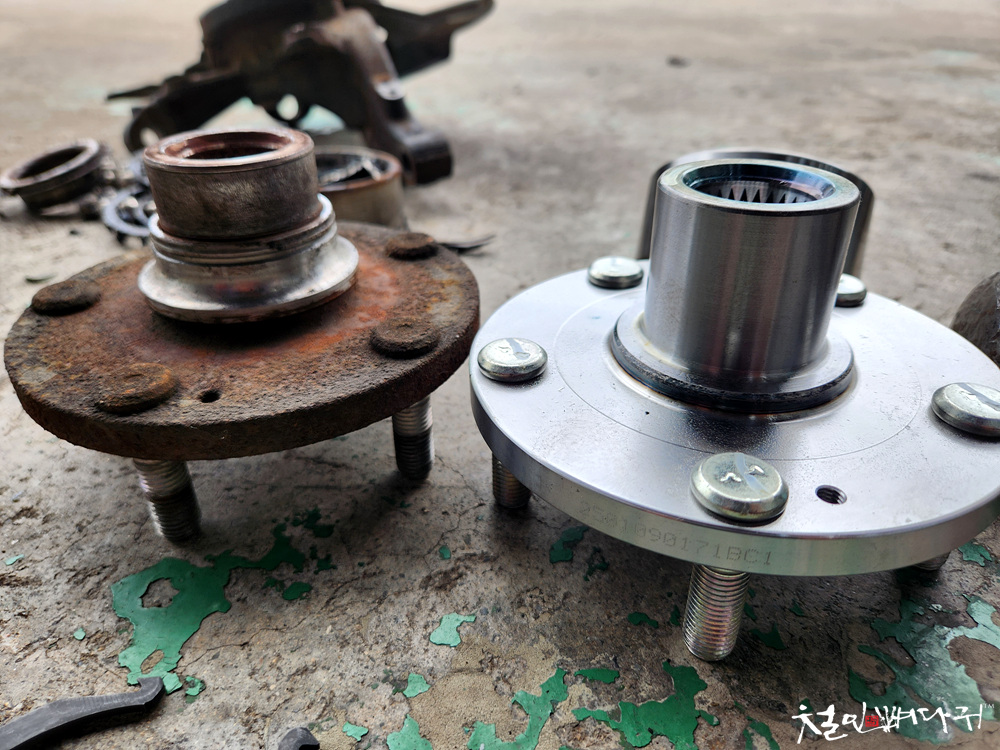 허브와 허브베어링을 새것으로 교체하는 작업을 합니다.