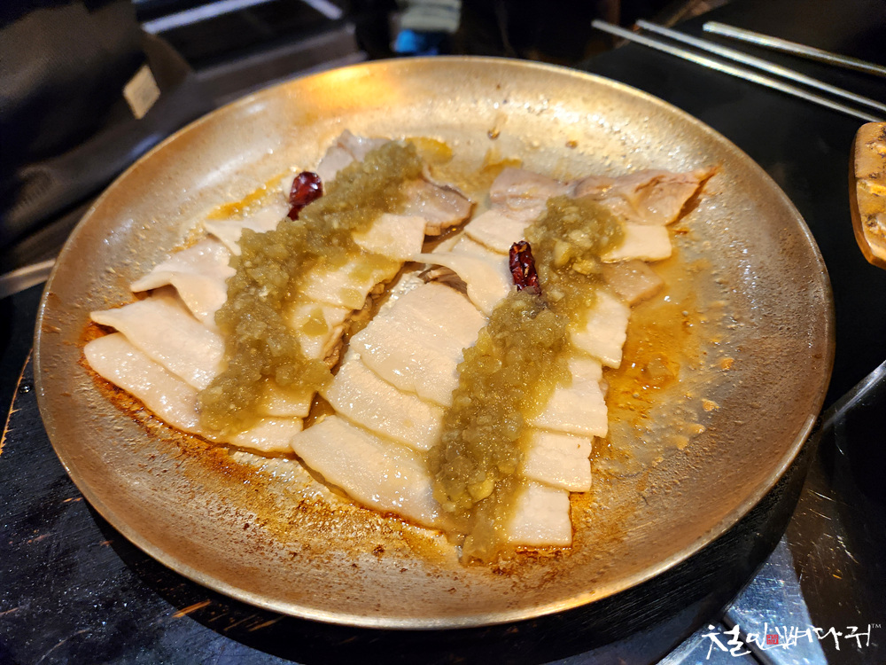 얇은 수육에 마늘양념이 올려진 채로 나왔습니다.